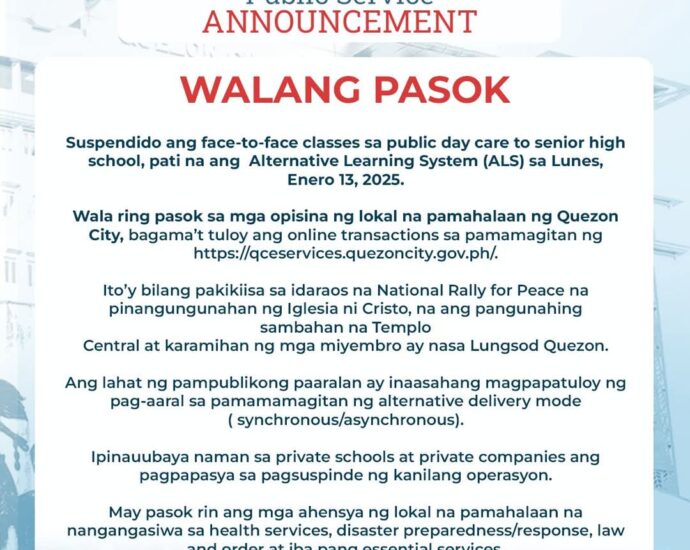 Class and Work in Quezon City suspended for National Rally for Peace 2025-01-11 By: Almar Danguilan On: January 11, 2025