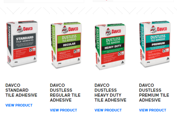 This provides an easy ordering for Davco Dustless Regular Tile Adhesive, Davco Heavy Duty Tile Adhesive, Davco Standard Tile Grout, Davco Captain Shield, DAvco k10 Sovacryl, Davco K11 Flex, and Lanko 101.