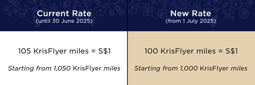 Kris+: 100 KrisPay miles per S$1 (from 150 KrisPay miles), with a reduced minimum of 10 KrisPay miles (previously 15 KrisPay miles).